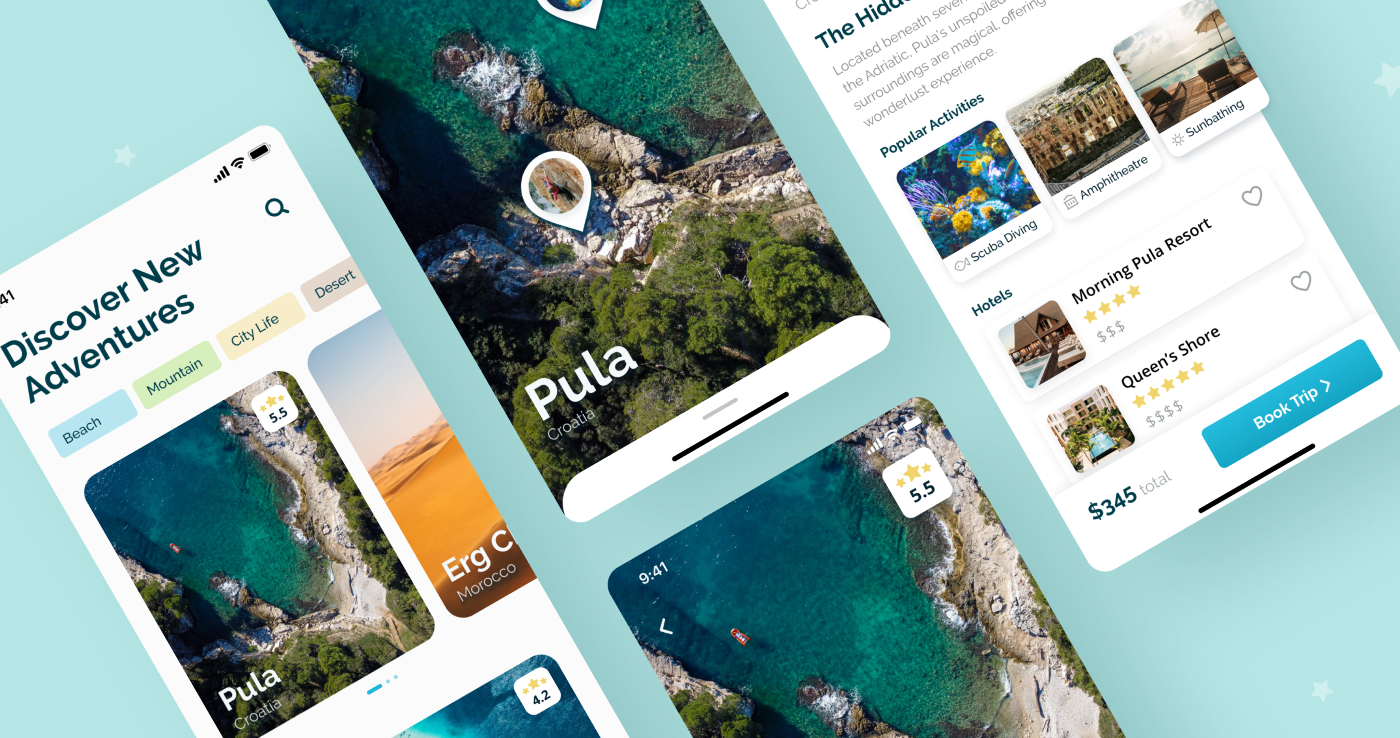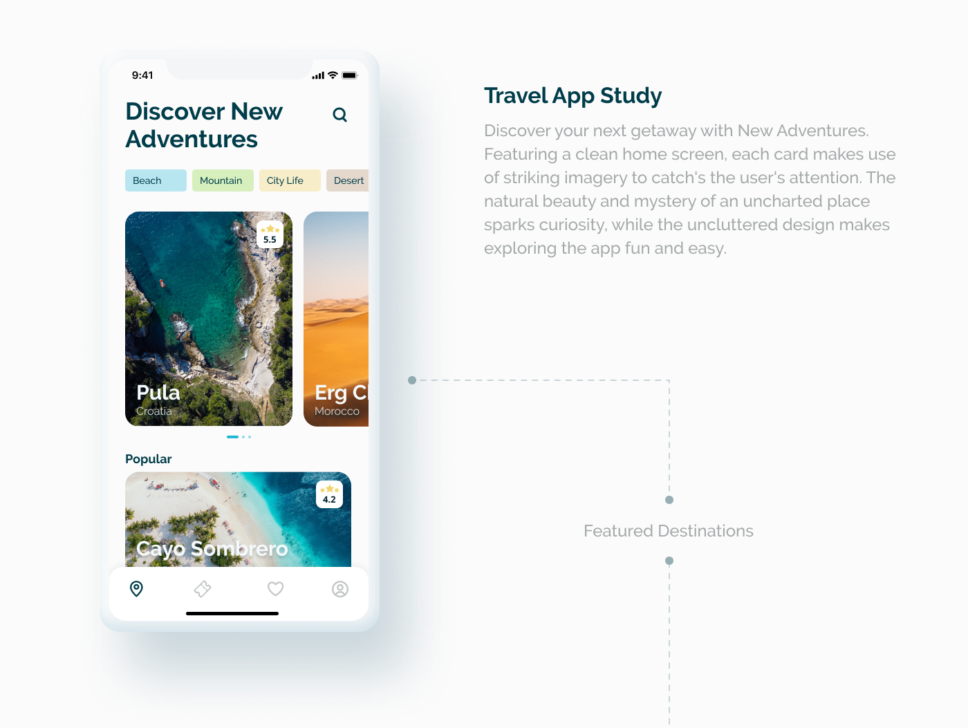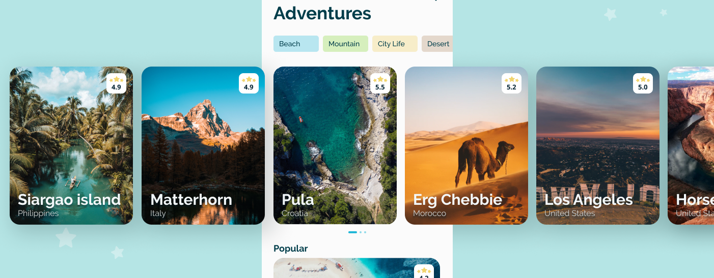 Find your next adventure with this quick UI practice. Each destination showcases their best scenery to draw the eye and invite curiosity. Discover a plethora of activities for all tastes, alongside beautiful resorts in just a few swipes.